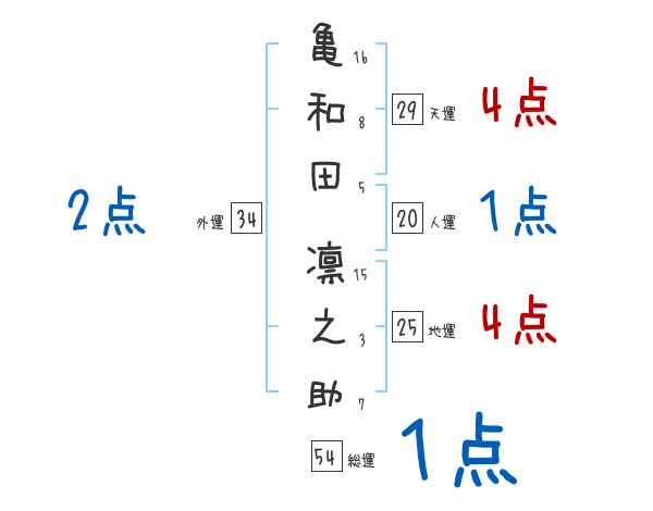 天運![]() | 亀和田凛之助さんの天運は29画の4つ星!完全主義で才能がある。厳格な心の持ち主。 家系が持つ宿命的な運勢を表します。祖先から受け継いだ苗字ですので自分の力が及びません。家柄を象徴します。 |