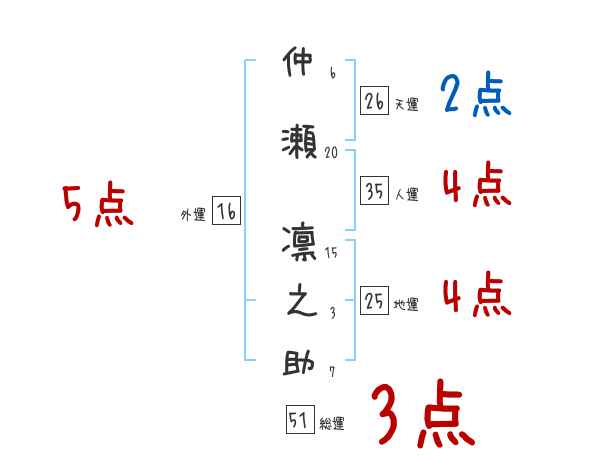 外運![]() | 仲瀬凛之助さんの外運は16画の5つ星!人望が厚く大きく発展する。逆転成功が見える。 生活面を象徴する運勢です。外部から受ける影響力を表し、結婚運、家庭運や職場、環境への順応性を表します。 |