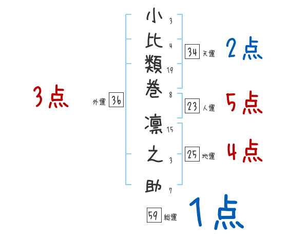 人運![]() | 小比類巻凛之助さんの人運は23画の5つ星!想像力に優れ活力がある。一代で成功し名誉を手に入れる。 性格や才能などを表す2番目に重要な運勢です。人間関係や協調性、社会的な成功に影響します。主に20歳から50歳ぐらいまでの中年期の運勢を表します。 |