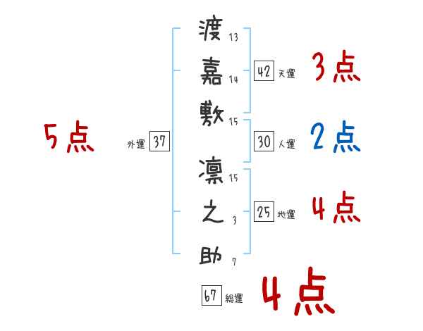 外運![]() | 渡嘉敷凛之助さんの外運は37画の5つ星!努力家で順応性に優れる。現実的な考え方ができ忠実に物事をこなす。 生活面を象徴する運勢です。外部から受ける影響力を表し、結婚運、家庭運や職場、環境への順応性を表します。 |