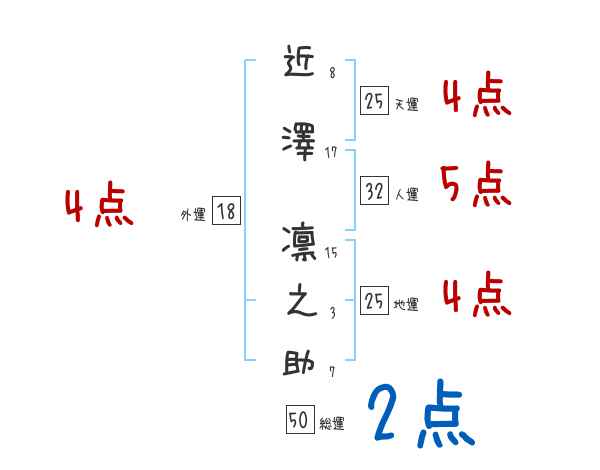 天運![]() | 近澤凛之助さんの天運は25画の4つ星!個性があり才能があふれる。強運の持ち主で発展する。 家系が持つ宿命的な運勢を表します。祖先から受け継いだ苗字ですので自分の力が及びません。家柄を象徴します。 |