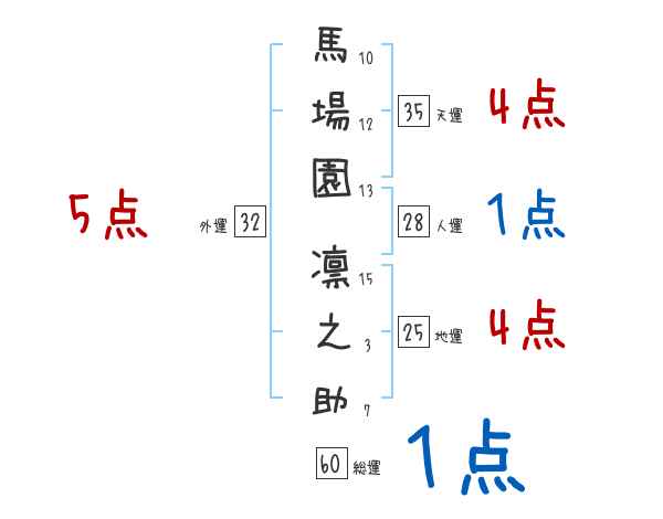 外運![]() | 馬場園凛之助さんの外運は32画の5つ星!柔軟性があり成功する。チャンスが多く金運が良い。 生活面を象徴する運勢です。外部から受ける影響力を表し、結婚運、家庭運や職場、環境への順応性を表します。 |
