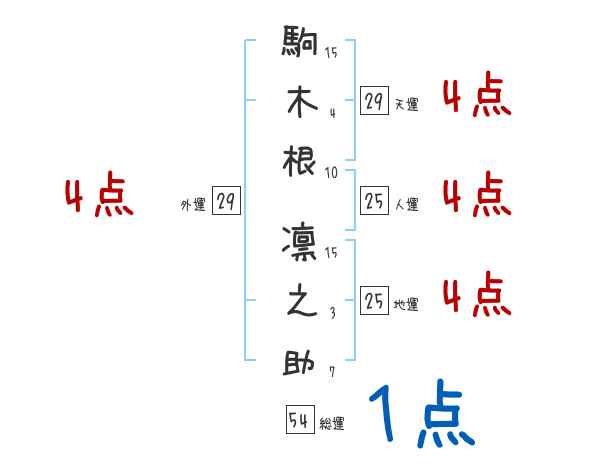 天運![]() | 駒木根凛之助さんの天運は29画の4つ星!完全主義で才能がある。厳格な心の持ち主。 家系が持つ宿命的な運勢を表します。祖先から受け継いだ苗字ですので自分の力が及びません。家柄を象徴します。 |