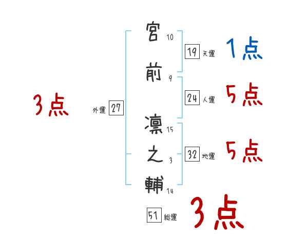 総運![]() | 宮前凛之輔さんの総運は51画の3つ星!変化が激しく、危険に注意。堅実な性格。 あなたの人生を表す1番重要な運勢です。生涯を通じて影響する総合運となり、主に50歳以降の晩年期に影響を及ぼします。 |
