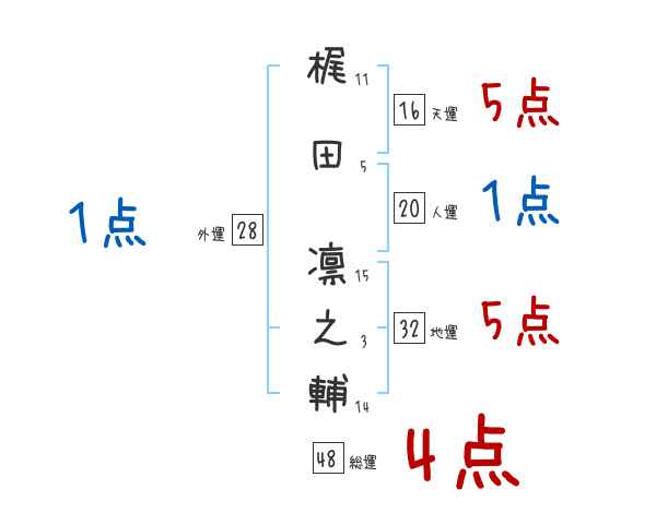 天運![]() | 梶田凛之輔さんの天運は16画の5つ星!人望が厚く大きく発展する。逆転成功が見える。 家系が持つ宿命的な運勢を表します。祖先から受け継いだ苗字ですので自分の力が及びません。家柄を象徴します。 |