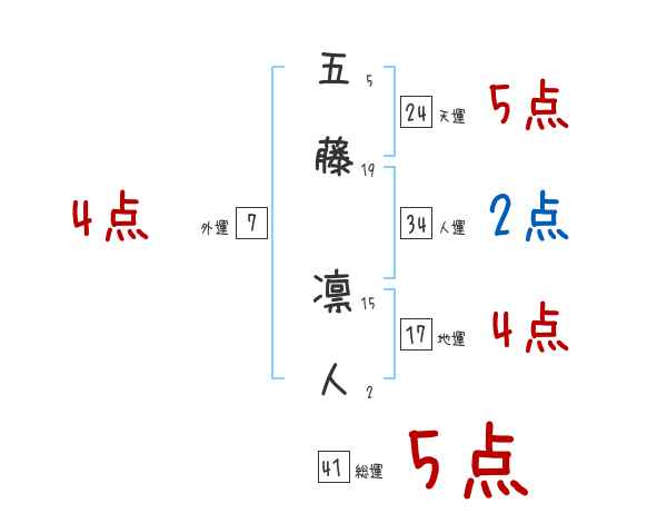 天運![]() | 五藤凛人さんの天運は24画の5つ星!家庭運が良く順調な人生。金運にも恵まれる。 家系が持つ宿命的な運勢を表します。祖先から受け継いだ苗字ですので自分の力が及びません。家柄を象徴します。 |