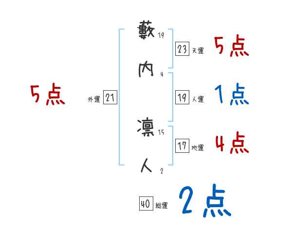 天運![]() | 藪内凛人さんの天運は23画の5つ星!想像力に優れ活力がある。一代で成功し名誉を手に入れる。 家系が持つ宿命的な運勢を表します。祖先から受け継いだ苗字ですので自分の力が及びません。家柄を象徴します。 |