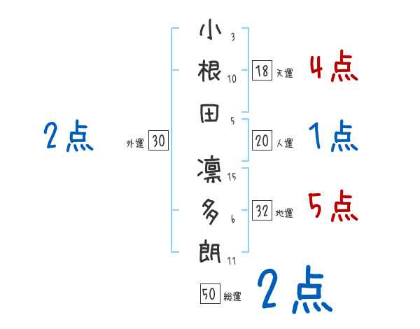 地運![]() | 小根田凛多朗さんの地運は32画の5つ星!柔軟性があり成功する。チャンスが多く金運が良い。 個性を表す基礎的な運勢です。性格形成や対人関係、行動力など家庭環境に影響されます。主に誕生してから20歳くらいまでの若年期の運勢を表します。 |