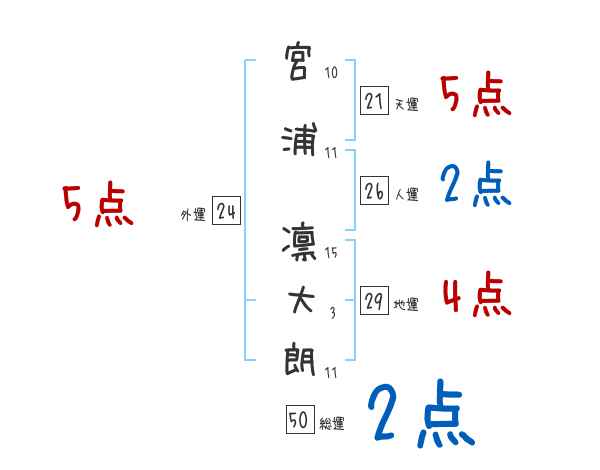 外運![]() | 宮浦凛大朗さんの外運は24画の5つ星!家庭運が良く順調な人生。金運にも恵まれる。 生活面を象徴する運勢です。外部から受ける影響力を表し、結婚運、家庭運や職場、環境への順応性を表します。 |