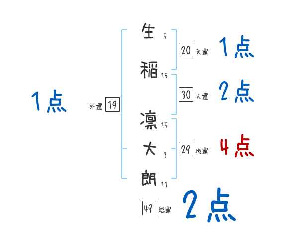 総運![]() | 生稲凛大朗さんの総運は49画の2つ星!不安定な性格で明暗がある人生。周りの人には支援されやすい。 あなたの人生を表す1番重要な運勢です。生涯を通じて影響する総合運となり、主に50歳以降の晩年期に影響を及ぼします。 |
