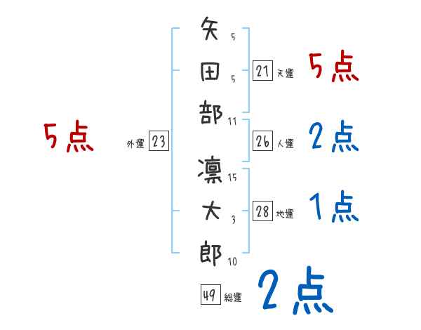 天運![]() | 矢田部凛大郎さんの天運は21画の5つ星!統率力がある。独立し成功する。名誉を手に入れる。 家系が持つ宿命的な運勢を表します。祖先から受け継いだ苗字ですので自分の力が及びません。家柄を象徴します。 |