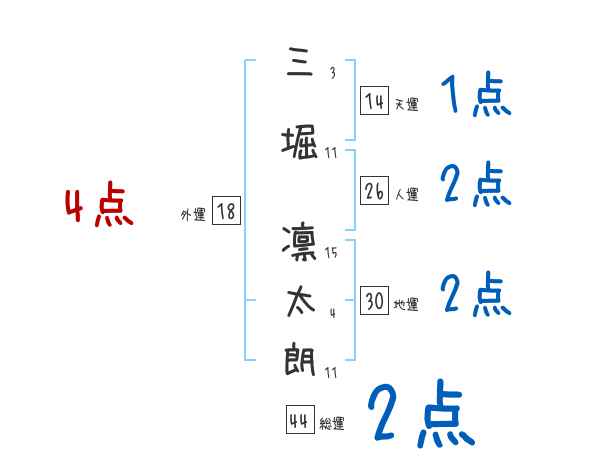 天運![]() | 三堀凛太朗さんの天運は14画の1つ星!人に対して優しいがストレスを溜め込みがち。人間関係のトラブルを避けるよう気をつけましょう。 家系が持つ宿命的な運勢を表します。祖先から受け継いだ苗字ですので自分の力が及びません。家柄を象徴します。 |