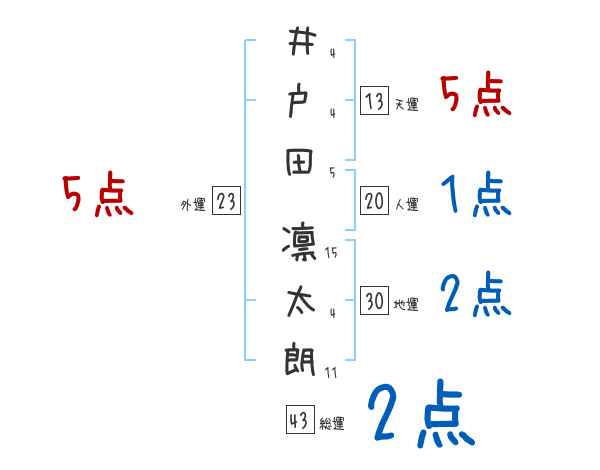 外運![]() | 井戸田凛太朗さんの外運は23画の5つ星!想像力に優れ活力がある。一代で成功し名誉を手に入れる。 生活面を象徴する運勢です。外部から受ける影響力を表し、結婚運、家庭運や職場、環境への順応性を表します。 |