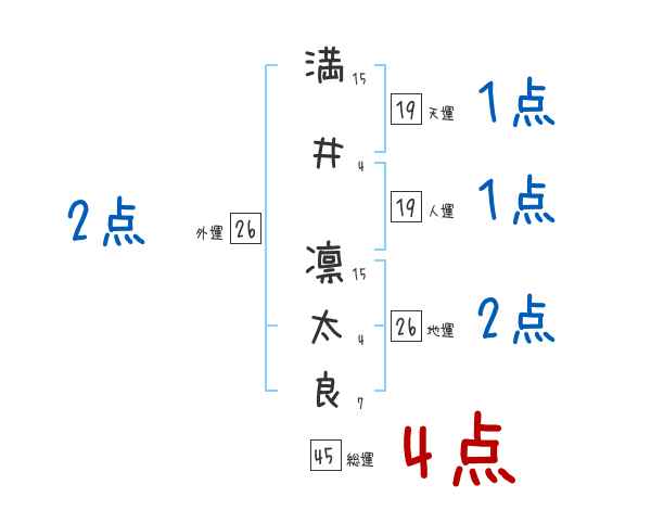 外運![]() | 満井凛太良さんの外運は26画の2つ星!波瀾万丈かも。信頼できる人を大事にしましょう。 生活面を象徴する運勢です。外部から受ける影響力を表し、結婚運、家庭運や職場、環境への順応性を表します。 |