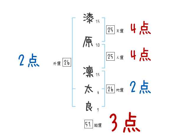 外運![]() | 漆原凛太良さんの外運は26画の2つ星!波瀾万丈かも。信頼できる人を大事にしましょう。 生活面を象徴する運勢です。外部から受ける影響力を表し、結婚運、家庭運や職場、環境への順応性を表します。 |