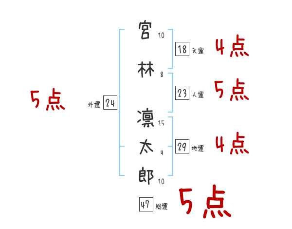 外運![]() | 宮林凛太郎さんの外運は24画の5つ星!家庭運が良く順調な人生。金運にも恵まれる。 生活面を象徴する運勢です。外部から受ける影響力を表し、結婚運、家庭運や職場、環境への順応性を表します。 |