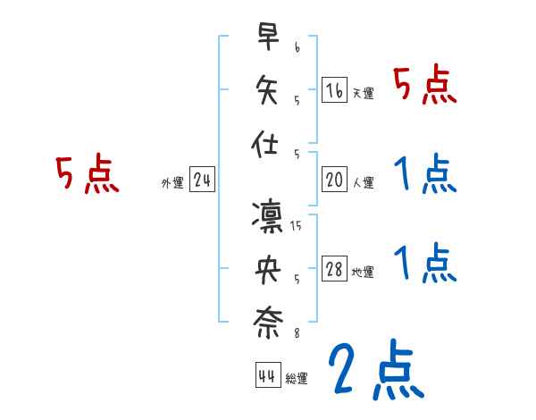 外運![]() | 早矢仕凛央奈さんの外運は24画の5つ星!家庭運が良く順調な人生。金運にも恵まれる。 生活面を象徴する運勢です。外部から受ける影響力を表し、結婚運、家庭運や職場、環境への順応性を表します。 |