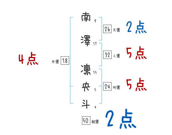 人運![]() | 南澤凛央斗さんの人運は32画の5つ星!柔軟性があり成功する。チャンスが多く金運が良い。 性格や才能などを表す2番目に重要な運勢です。人間関係や協調性、社会的な成功に影響します。主に20歳から50歳ぐらいまでの中年期の運勢を表します。 |