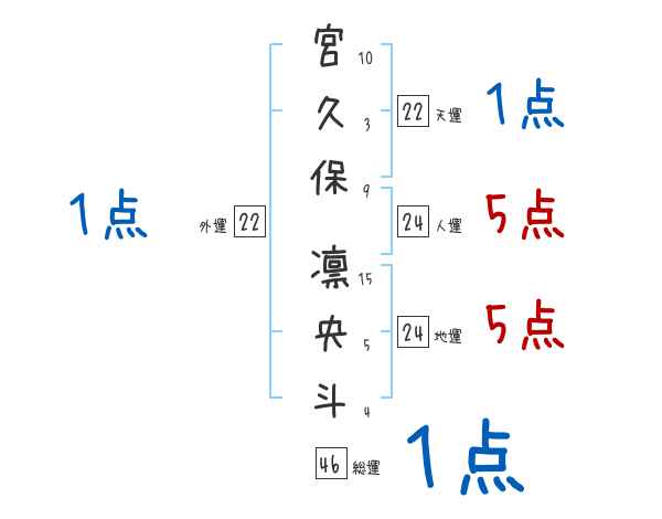 外運![]() | 宮久保凛央斗さんの外運は22画の1つ星!努力することが苦手ないっぽう手先が器用。芸術性にも優れる。 生活面を象徴する運勢です。外部から受ける影響力を表し、結婚運、家庭運や職場、環境への順応性を表します。 |