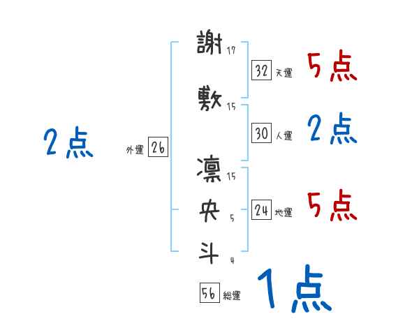 天運![]() | 謝敷凛央斗さんの天運は32画の5つ星!柔軟性があり成功する。チャンスが多く金運が良い。 家系が持つ宿命的な運勢を表します。祖先から受け継いだ苗字ですので自分の力が及びません。家柄を象徴します。 |