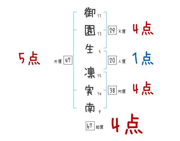 外運![]() | 御園生凛実南さんの外運は47画の5つ星!実力が開花し発展する円満な人生。財に恵まれる。 生活面を象徴する運勢です。外部から受ける影響力を表し、結婚運、家庭運や職場、環境への順応性を表します。 |