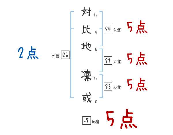 総運![]() | 対比地凛或さんの総運は47画の5つ星!実力が開花し発展する円満な人生。財に恵まれる。 あなたの人生を表す1番重要な運勢です。生涯を通じて影響する総合運となり、主に50歳以降の晩年期に影響を及ぼします。 |