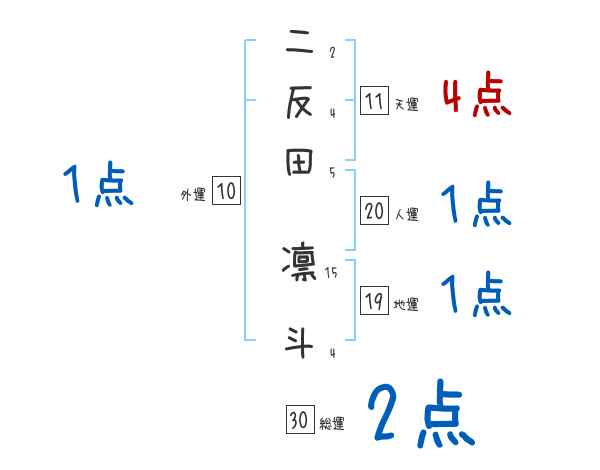天運![]() | 二反田凛斗さんの天運は11画の4つ星!着実に富や地位を得る幸運な人生。 家系が持つ宿命的な運勢を表します。祖先から受け継いだ苗字ですので自分の力が及びません。家柄を象徴します。 |
