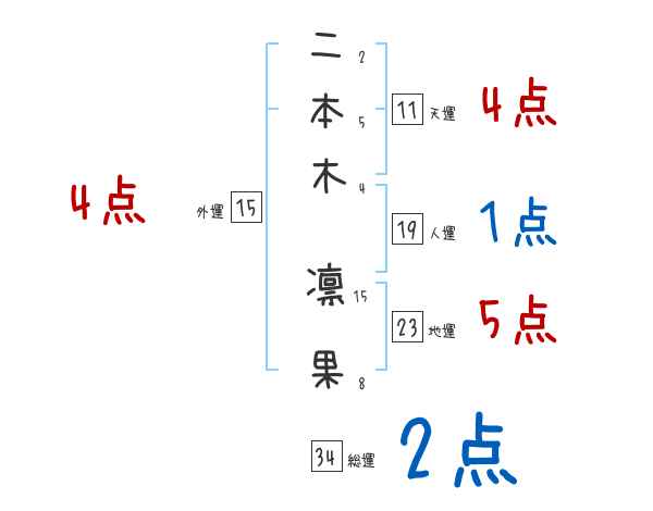 総運![]() | 二本木凛果さんの総運は34画の2つ星!独創性に優れるが、自尊心が強く災難に注意しましょう。 あなたの人生を表す1番重要な運勢です。生涯を通じて影響する総合運となり、主に50歳以降の晩年期に影響を及ぼします。 |
