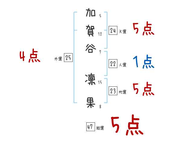 総運![]() | 加賀谷凛果さんの総運は47画の5つ星!実力が開花し発展する円満な人生。財に恵まれる。 あなたの人生を表す1番重要な運勢です。生涯を通じて影響する総合運となり、主に50歳以降の晩年期に影響を及ぼします。 |