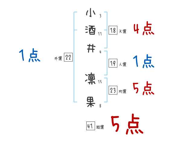 外運![]() | 小酒井凛果さんの外運は22画の1つ星!努力することが苦手ないっぽう手先が器用。芸術性にも優れる。 生活面を象徴する運勢です。外部から受ける影響力を表し、結婚運、家庭運や職場、環境への順応性を表します。 |