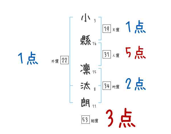 総運![]() | 小縣凛汰朗さんの総運は53画の3つ星!やや見栄っ張りで虚栄心がある。散財に注意。 あなたの人生を表す1番重要な運勢です。生涯を通じて影響する総合運となり、主に50歳以降の晩年期に影響を及ぼします。 |