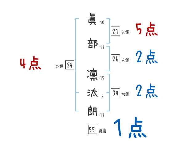 外運![]() | 眞部凛汰朗さんの外運は29画の4つ星!完全主義で才能がある。厳格な心の持ち主。 生活面を象徴する運勢です。外部から受ける影響力を表し、結婚運、家庭運や職場、環境への順応性を表します。 |