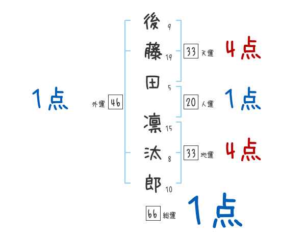 天運![]() | 後藤田凛汰郎さんの天運は33画の4つ星!権力志向でプライドが高い。勇気があり運を切り開き成功する。 家系が持つ宿命的な運勢を表します。祖先から受け継いだ苗字ですので自分の力が及びません。家柄を象徴します。 |