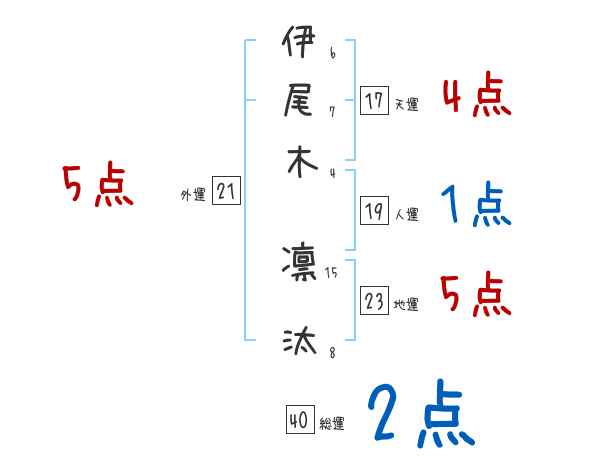 外運![]() | 伊尾木凛汰さんの外運は21画の5つ星!統率力がある。独立し成功する。名誉を手に入れる。 生活面を象徴する運勢です。外部から受ける影響力を表し、結婚運、家庭運や職場、環境への順応性を表します。 |