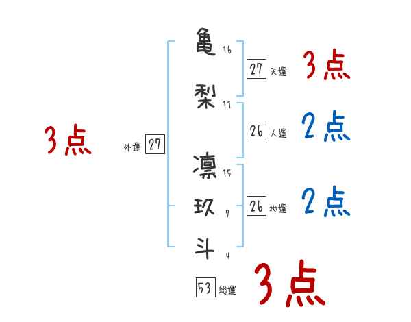 総運![]() | 亀梨凛玖斗さんの総運は53画の3つ星!やや見栄っ張りで虚栄心がある。散財に注意。 あなたの人生を表す1番重要な運勢です。生涯を通じて影響する総合運となり、主に50歳以降の晩年期に影響を及ぼします。 |