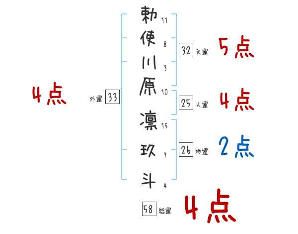 総運![]() | 勅使川原凛玖斗さんの総運は58画の4つ星!安定した生活。大器晩成タイプ。 あなたの人生を表す1番重要な運勢です。生涯を通じて影響する総合運となり、主に50歳以降の晩年期に影響を及ぼします。 |