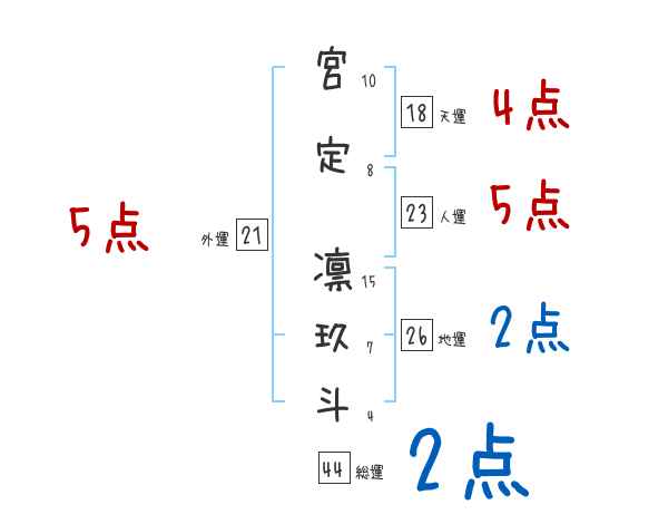 人運![]() | 宮定凛玖斗さんの人運は23画の5つ星!想像力に優れ活力がある。一代で成功し名誉を手に入れる。 性格や才能などを表す2番目に重要な運勢です。人間関係や協調性、社会的な成功に影響します。主に20歳から50歳ぐらいまでの中年期の運勢を表します。 |