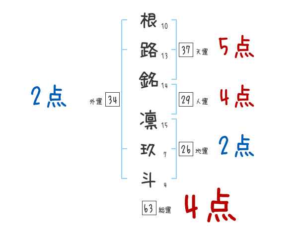 総運![]() | 根路銘凛玖斗さんの総運は63画の4つ星!家庭運がよく順調な生活。温和な性格。 あなたの人生を表す1番重要な運勢です。生涯を通じて影響する総合運となり、主に50歳以降の晩年期に影響を及ぼします。 |