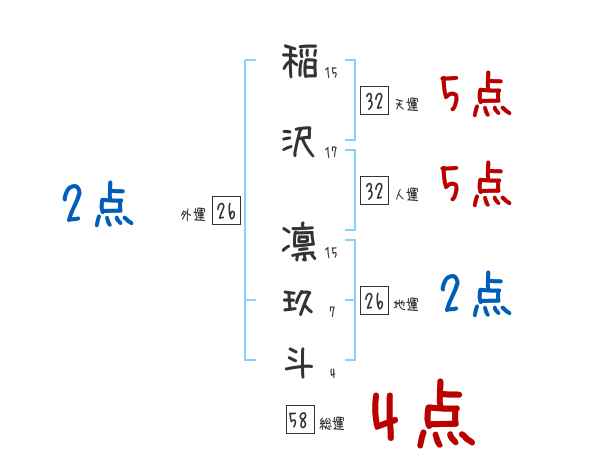 天運![]() | 稲沢凛玖斗さんの天運は32画の5つ星!柔軟性があり成功する。チャンスが多く金運が良い。 家系が持つ宿命的な運勢を表します。祖先から受け継いだ苗字ですので自分の力が及びません。家柄を象徴します。 |