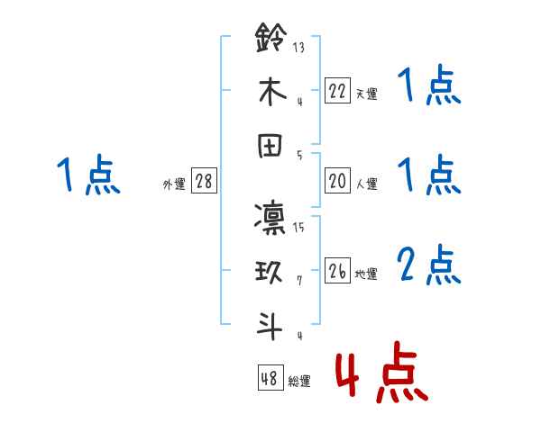 総運![]() | 鈴木田凛玖斗さんの総運は48画の4つ星!賢明な性格で人望が厚い。指導力があり多くの人に尊敬される。 あなたの人生を表す1番重要な運勢です。生涯を通じて影響する総合運となり、主に50歳以降の晩年期に影響を及ぼします。 |