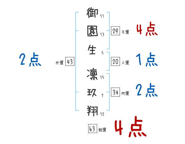 総運![]() | 御園生凛玖翔さんの総運は63画の4つ星!家庭運がよく順調な生活。温和な性格。 あなたの人生を表す1番重要な運勢です。生涯を通じて影響する総合運となり、主に50歳以降の晩年期に影響を及ぼします。 |