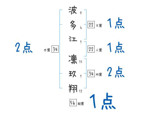 天運![]() | 波多江凛玖翔さんの天運は22画の1つ星!努力することが苦手ないっぽう手先が器用。芸術性にも優れる。 家系が持つ宿命的な運勢を表します。祖先から受け継いだ苗字ですので自分の力が及びません。家柄を象徴します。 |