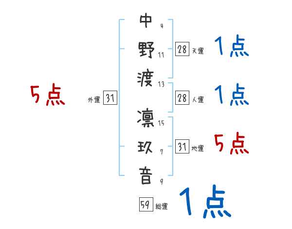 総運![]() | 中野渡凛玖音さんの総運は59画の1つ星!意志の弱さであきらめることが多いかも。粘り強さが必要。 あなたの人生を表す1番重要な運勢です。生涯を通じて影響する総合運となり、主に50歳以降の晩年期に影響を及ぼします。 |