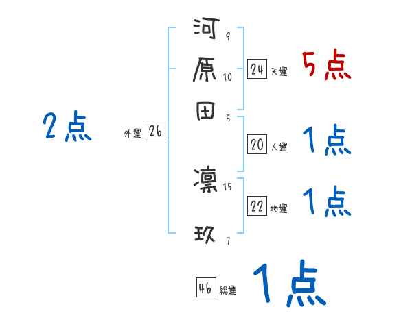 天運![]() | 河原田凛玖さんの天運は24画の5つ星!家庭運が良く順調な人生。金運にも恵まれる。 家系が持つ宿命的な運勢を表します。祖先から受け継いだ苗字ですので自分の力が及びません。家柄を象徴します。 |