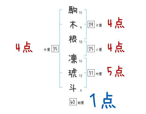 外運![]() | 駒木根凛琥斗さんの外運は35画の4つ星!温厚な性格で感受性が高い。穏和な性格で人望が厚い。 生活面を象徴する運勢です。外部から受ける影響力を表し、結婚運、家庭運や職場、環境への順応性を表します。 |