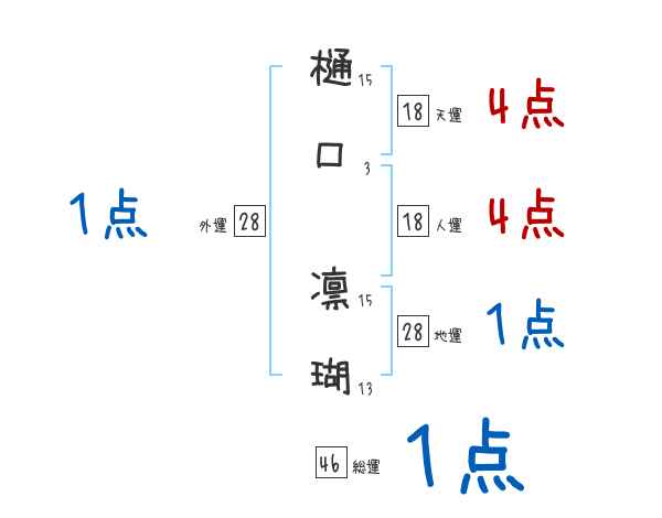 天運![]() | 樋口凛瑚さんの天運は18画の4つ星!情熱的で剛気。忍耐力があり信頼される。 家系が持つ宿命的な運勢を表します。祖先から受け継いだ苗字ですので自分の力が及びません。家柄を象徴します。 |