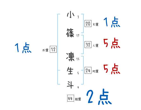 人運![]() | 小篠凛生斗さんの人運は32画の5つ星!柔軟性があり成功する。チャンスが多く金運が良い。 性格や才能などを表す2番目に重要な運勢です。人間関係や協調性、社会的な成功に影響します。主に20歳から50歳ぐらいまでの中年期の運勢を表します。 |