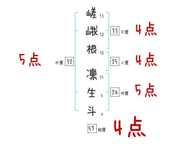 総運![]() | 嵯峨根凛生斗さんの総運は57画の4つ星!向上心があり人望がある。地位を得る。 あなたの人生を表す1番重要な運勢です。生涯を通じて影響する総合運となり、主に50歳以降の晩年期に影響を及ぼします。 |