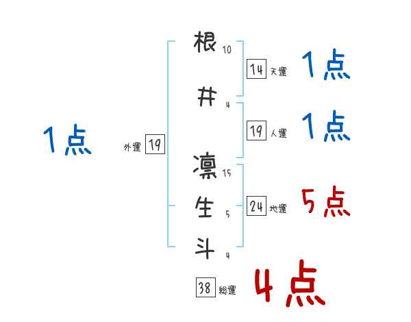 外運![]() | 根井凛生斗さんの外運は19画の1つ星!優れた才能を持ちますが、協調性が足りないことも。周りの人と協力する事を意識しましょう。 生活面を象徴する運勢です。外部から受ける影響力を表し、結婚運、家庭運や職場、環境への順応性を表します。 |
