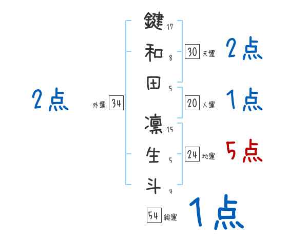 天運![]() | 鍵和田凛生斗さんの天運は30画の2つ星!浮き沈みの激しさに注意しましょう。 家系が持つ宿命的な運勢を表します。祖先から受け継いだ苗字ですので自分の力が及びません。家柄を象徴します。 |